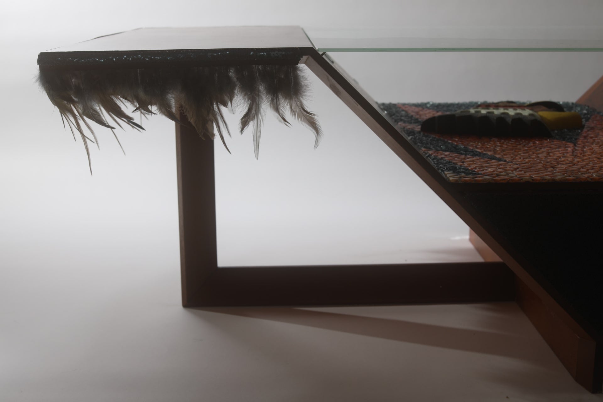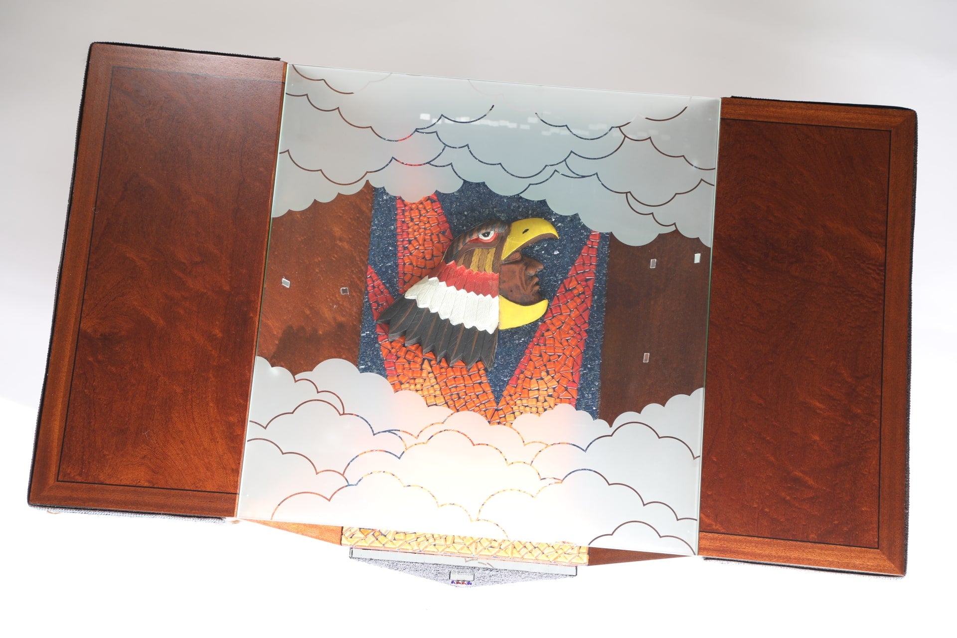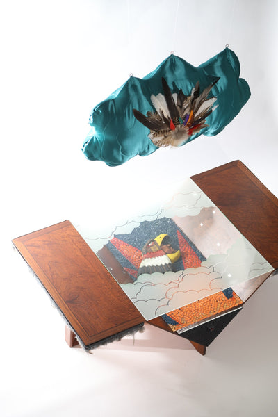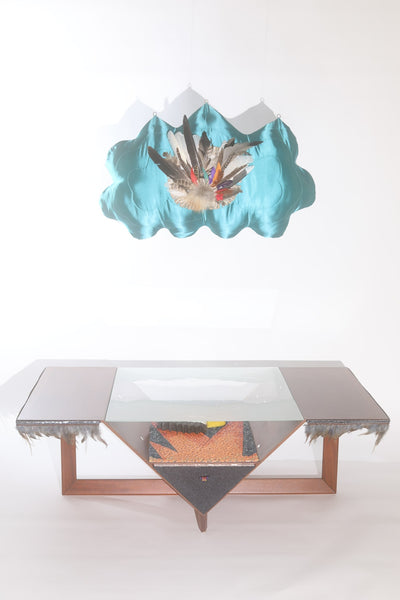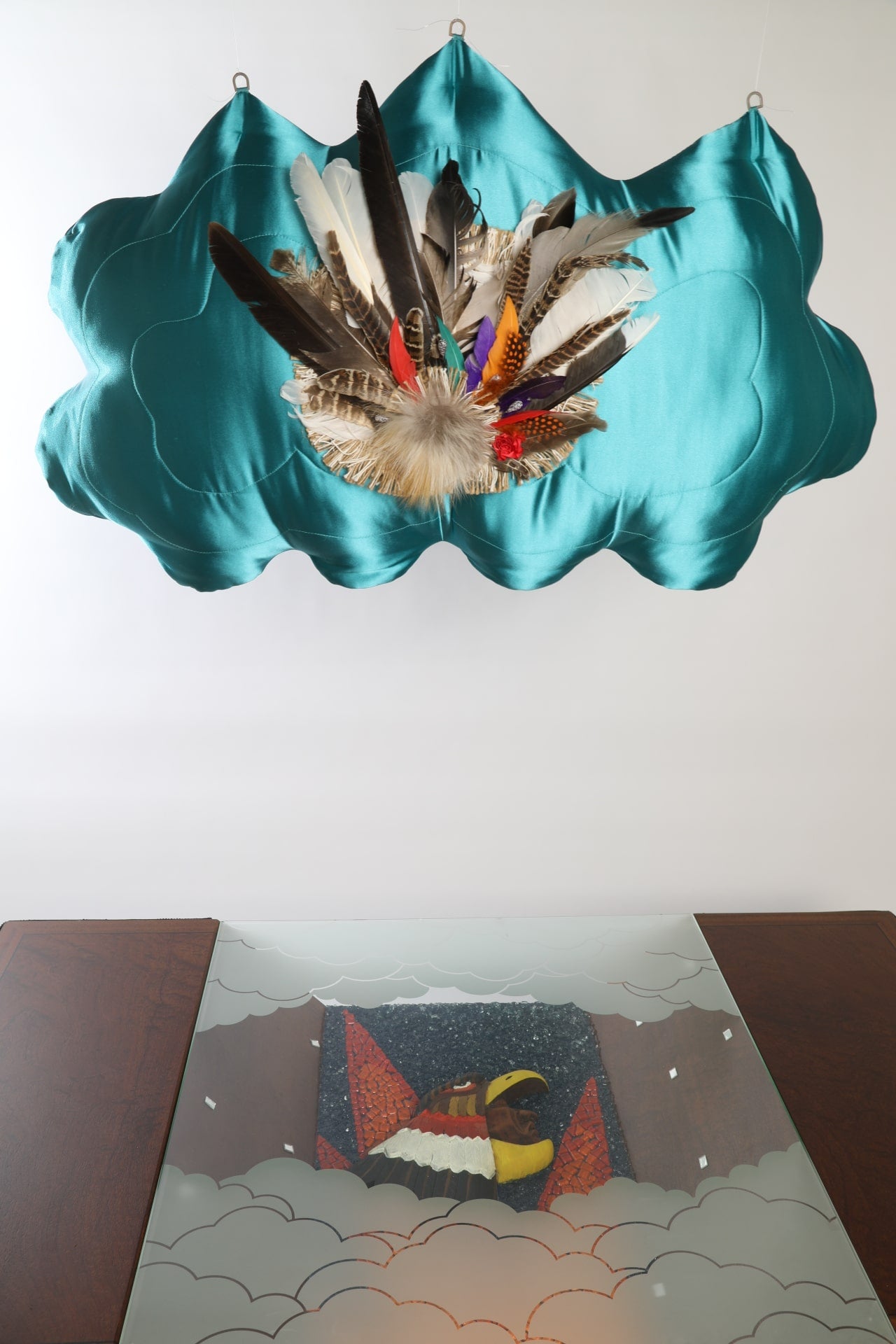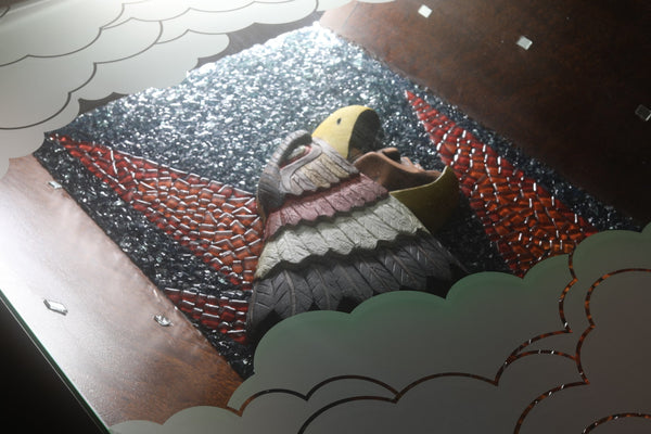 The table is in the shape of an eagle’s outspread wings. The carved profile of the Native American peeks out from under the glass, which has an etching in the shape of clouds. On top is an azure silk Datura pillow* in the shape of a cloud.