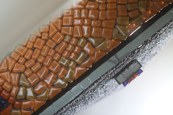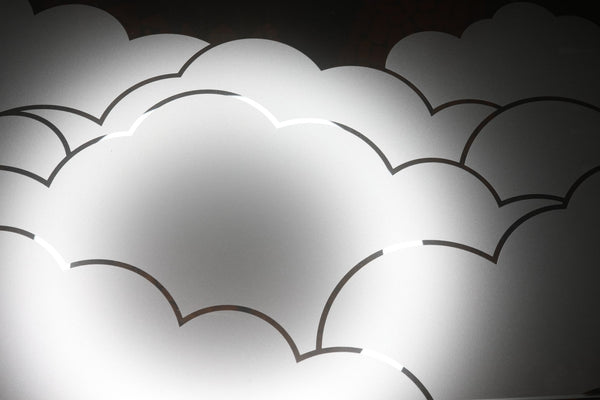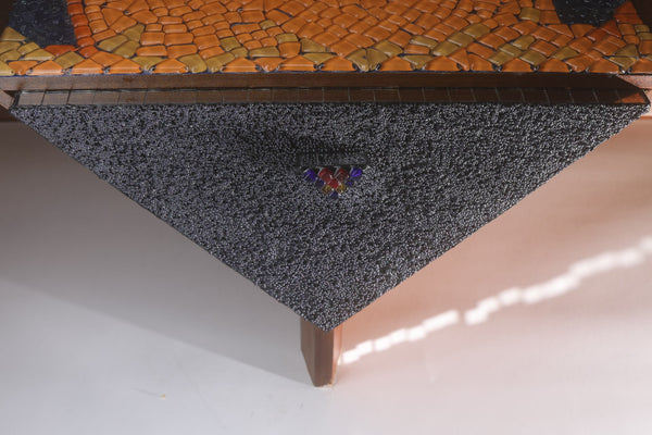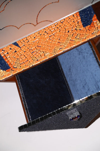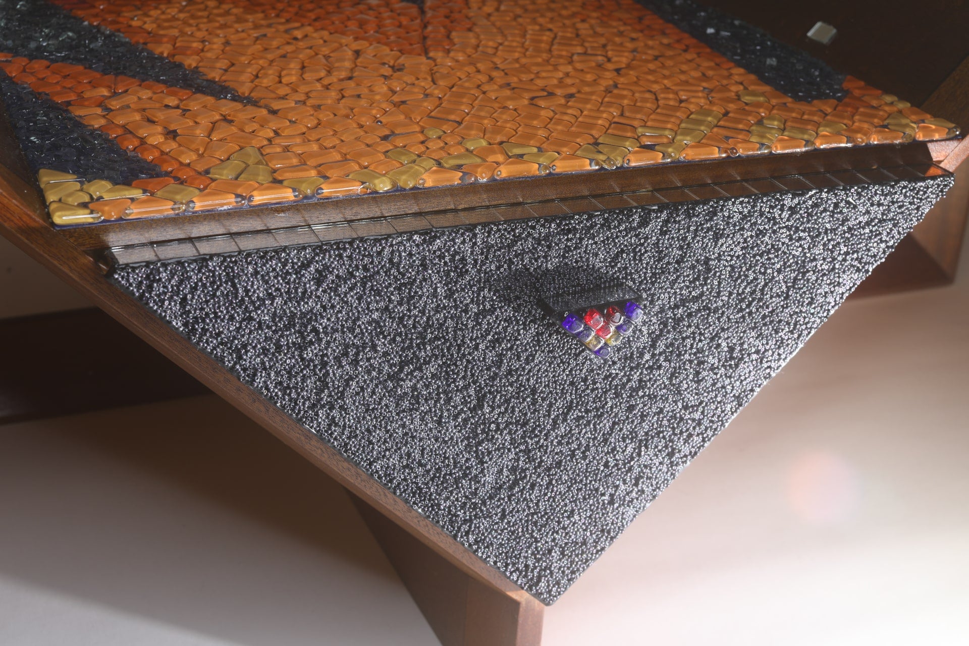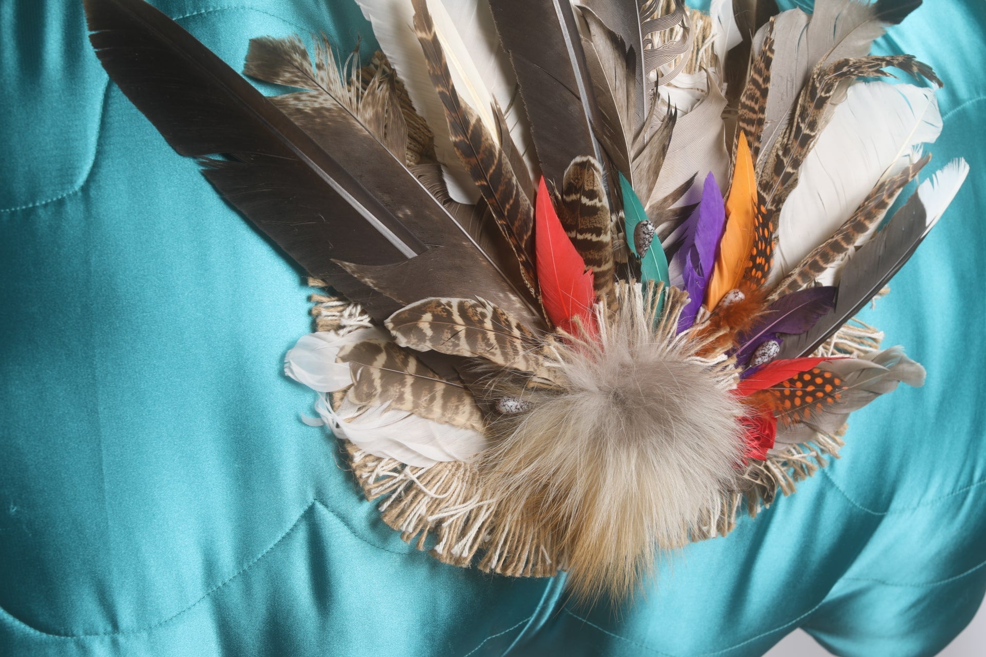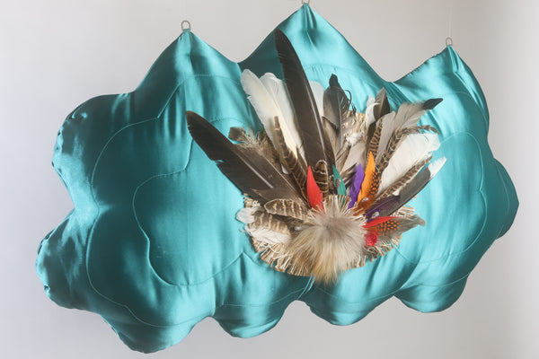 The table is in the shape of an eagle’s outspread wings. The carved profile of the Native American peeks out from under the glass, which has an etching in the shape of clouds. On top is an azure silk Datura pillow* in the shape of a cloud.