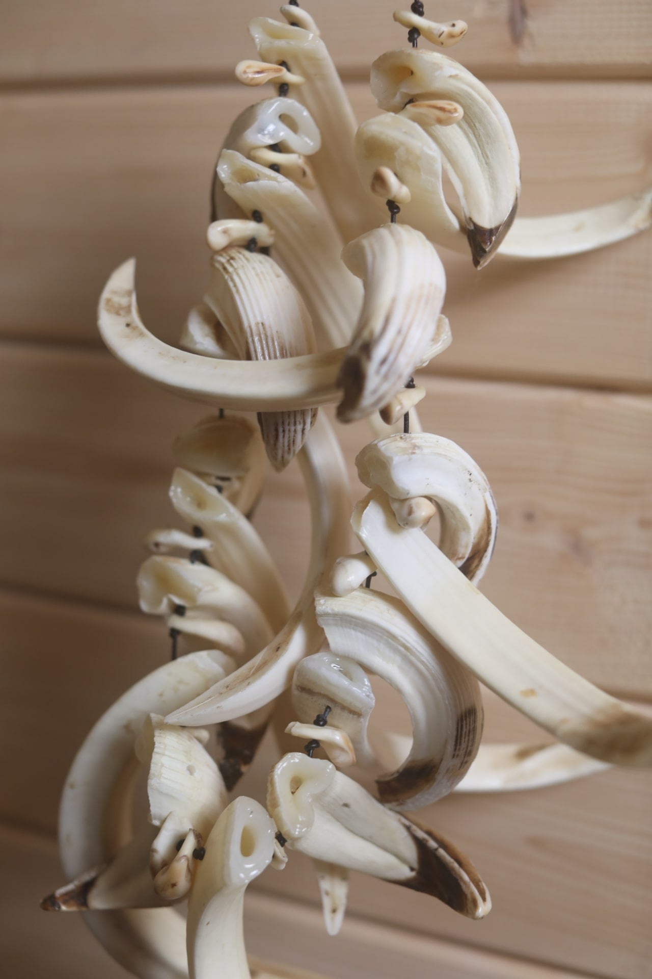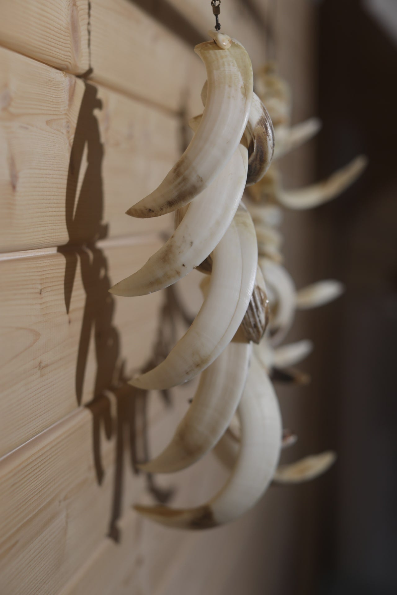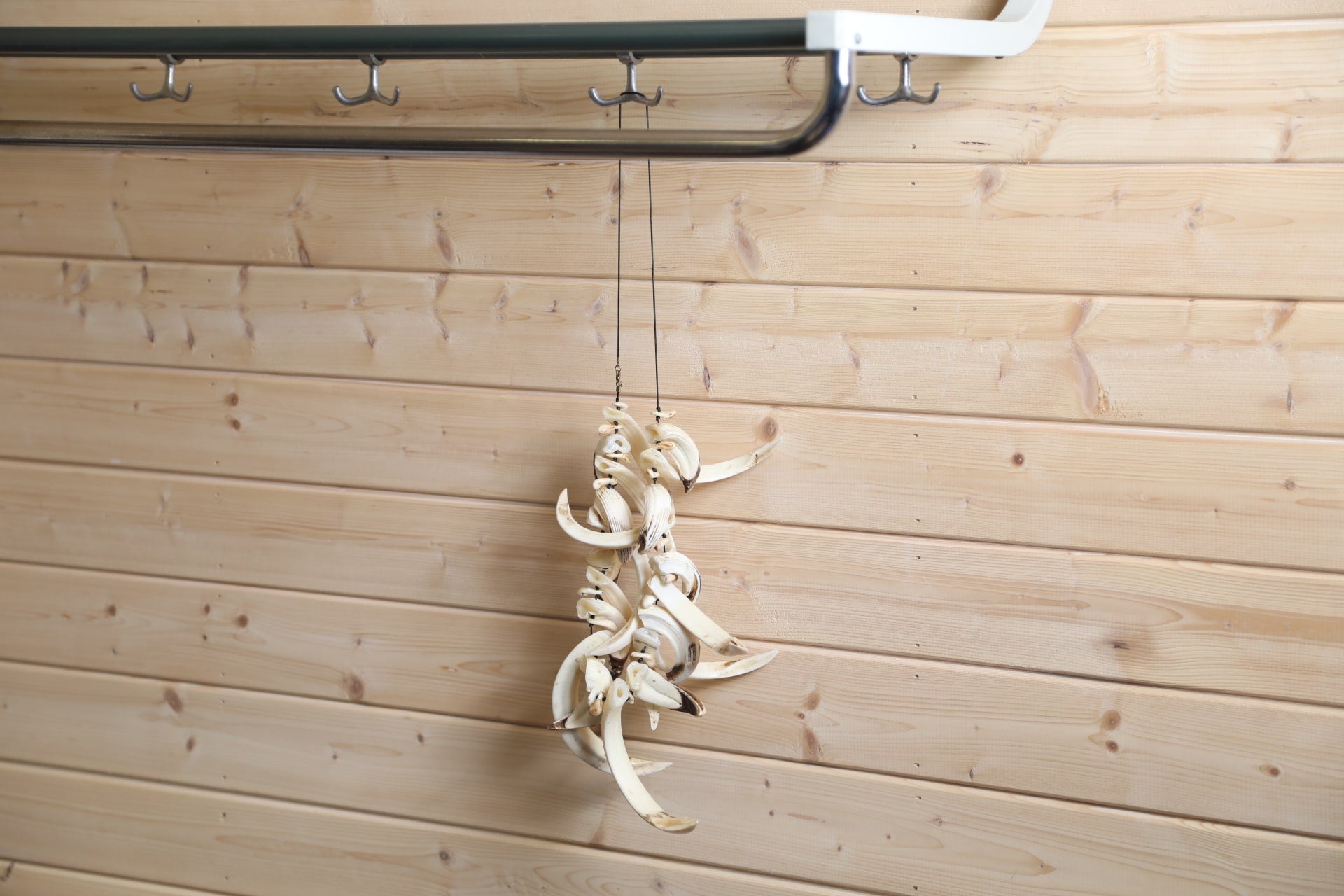 This hanger from an electric train from the 1970s was bought at a flea market in Stockholm. A necklace of wild boar fangs and so-called “pearl” teeth (upper canines) from a noble deer hangs from a hook. It is in almost perfect condition, which suggests that this rare item was used by just one person. This must have been a train driver, as he would be the only one who could get to the remains of animals hit by the train.