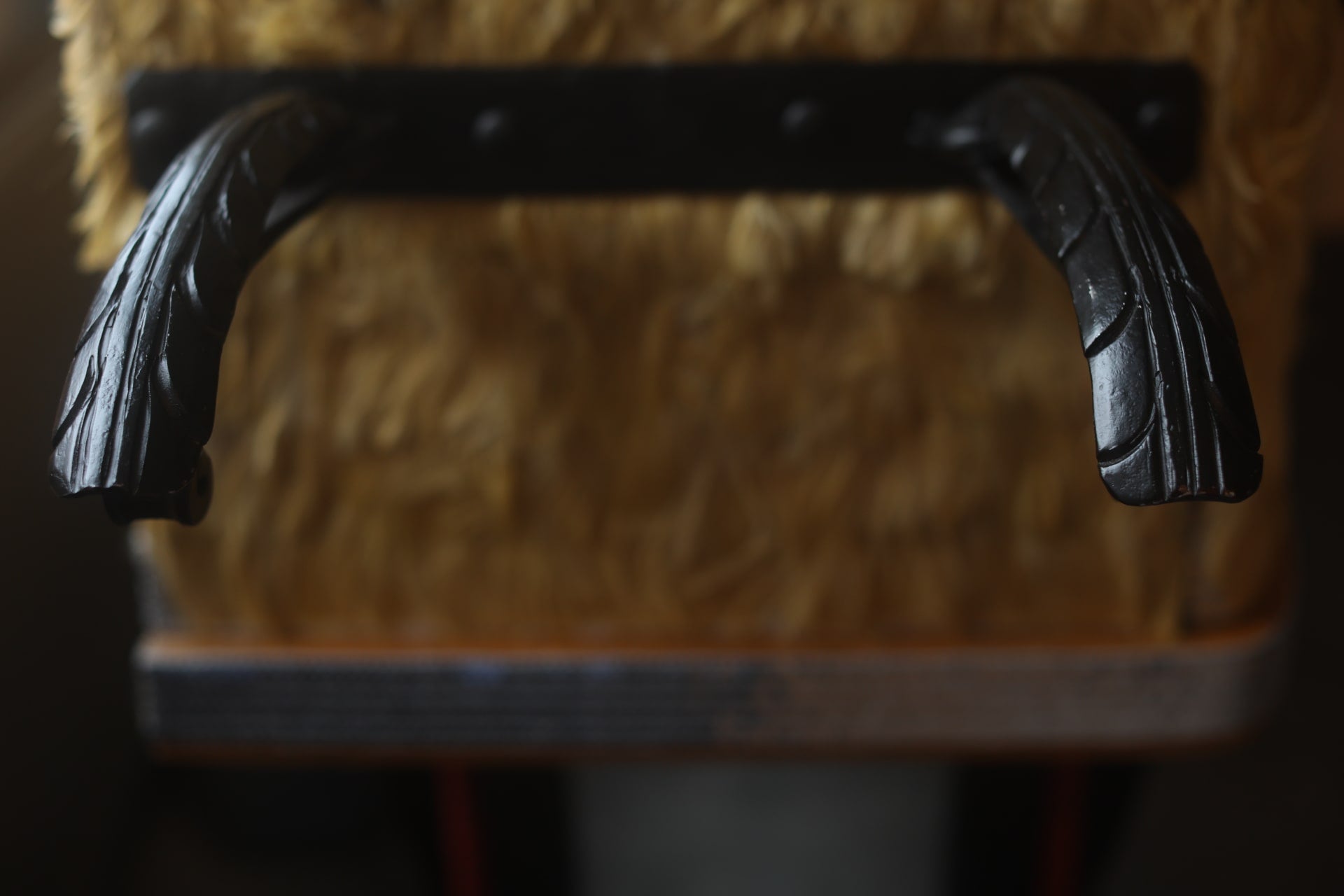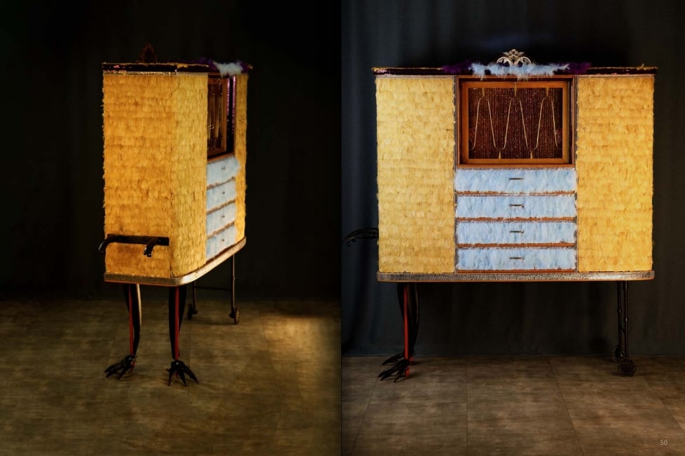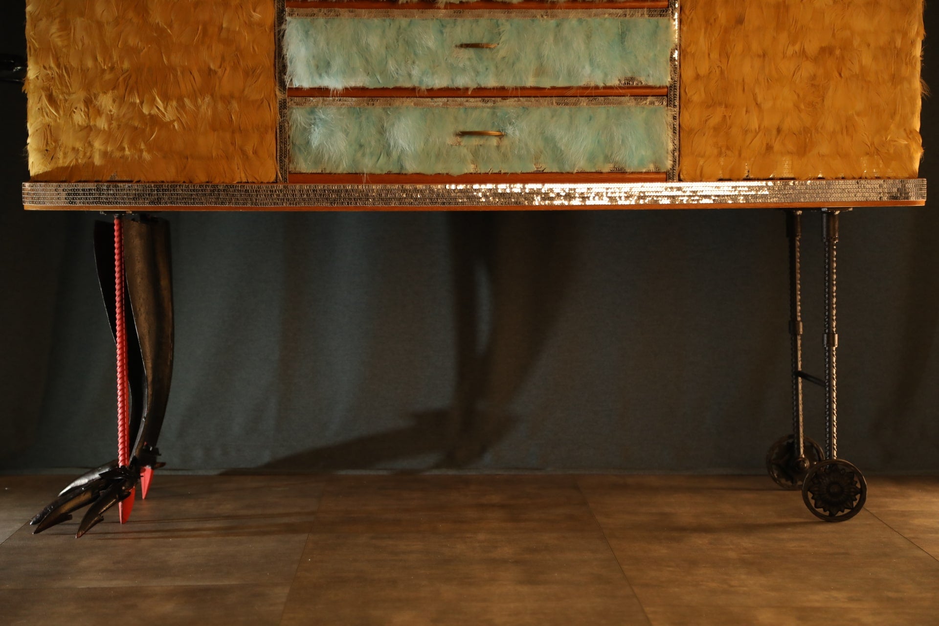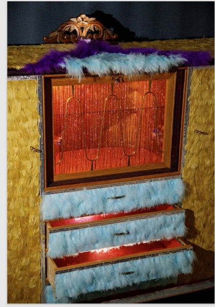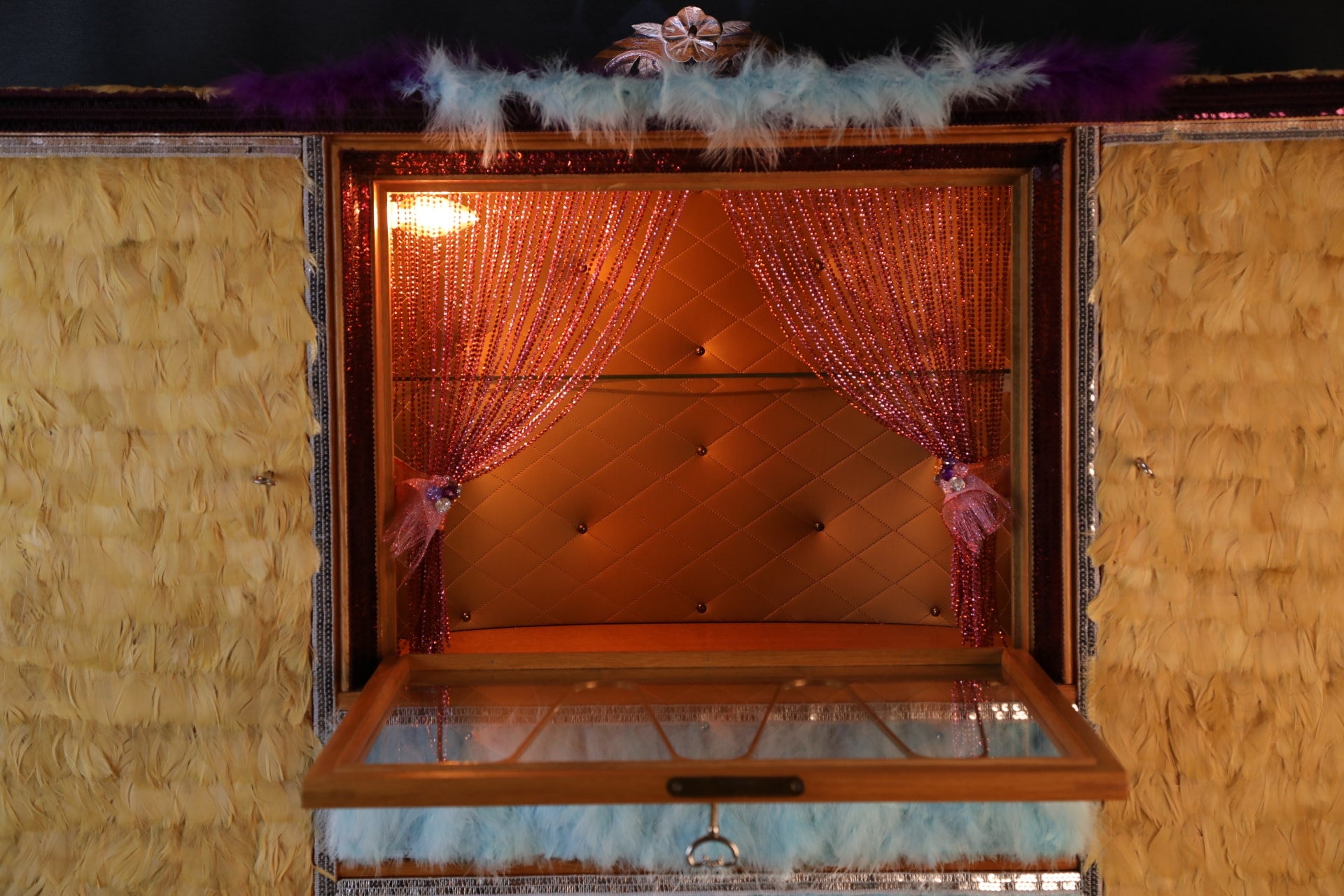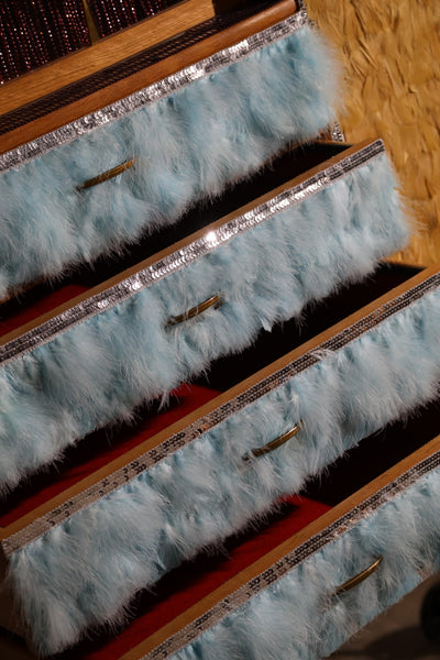 A convenient bureau desk that is feminine in essence and form from the 1950s. Inspired by the American Pin-Up style for the boudoir. The table can be easily moved by lifting one side. There is a mirror on the other side, and it has drawers inside it for basic essentials.