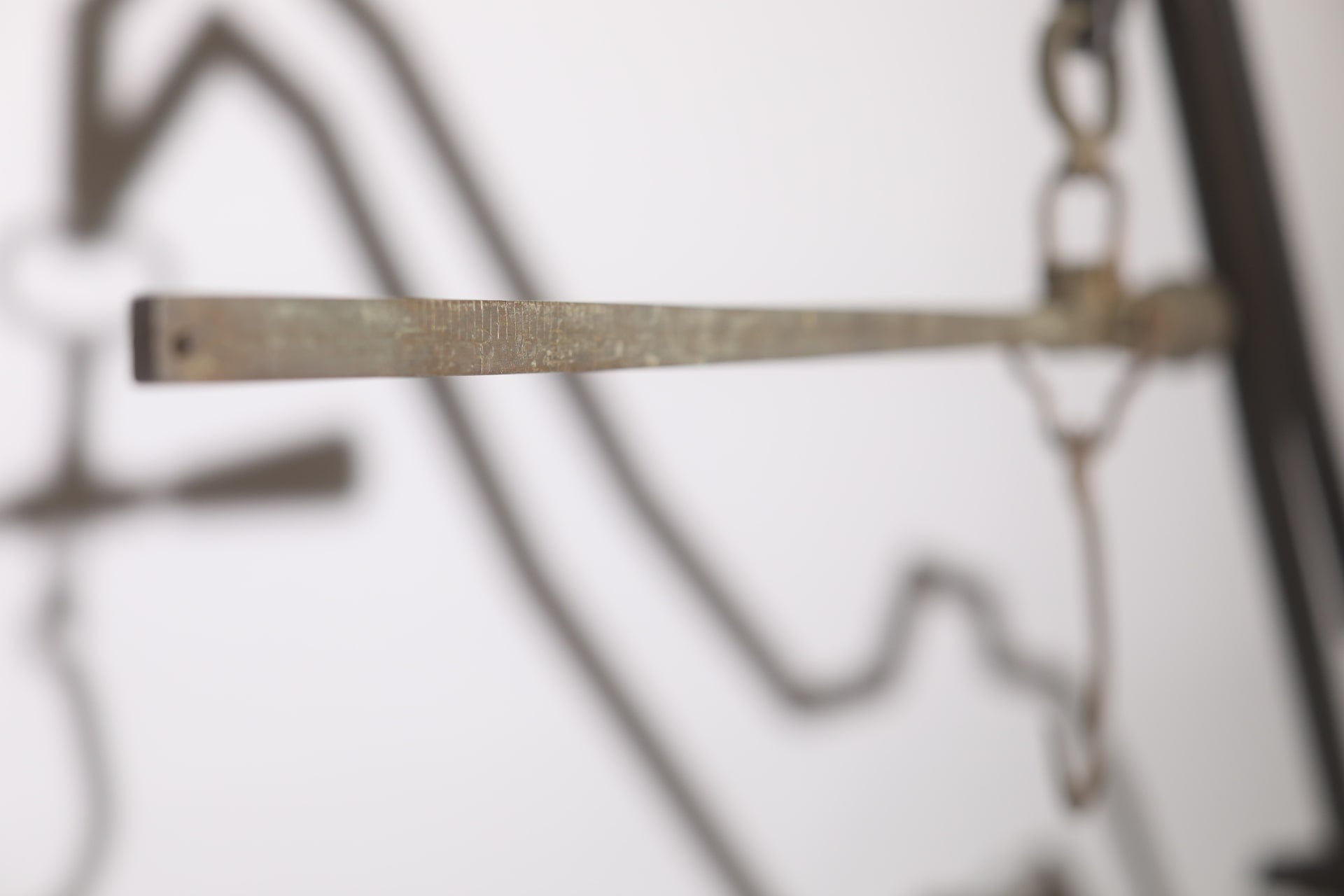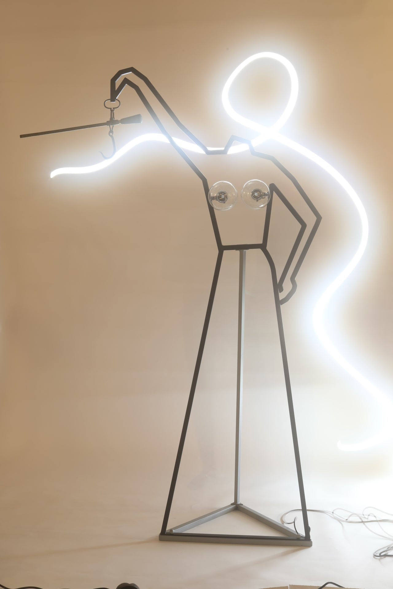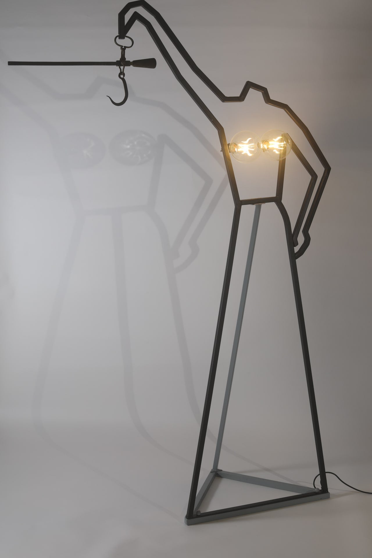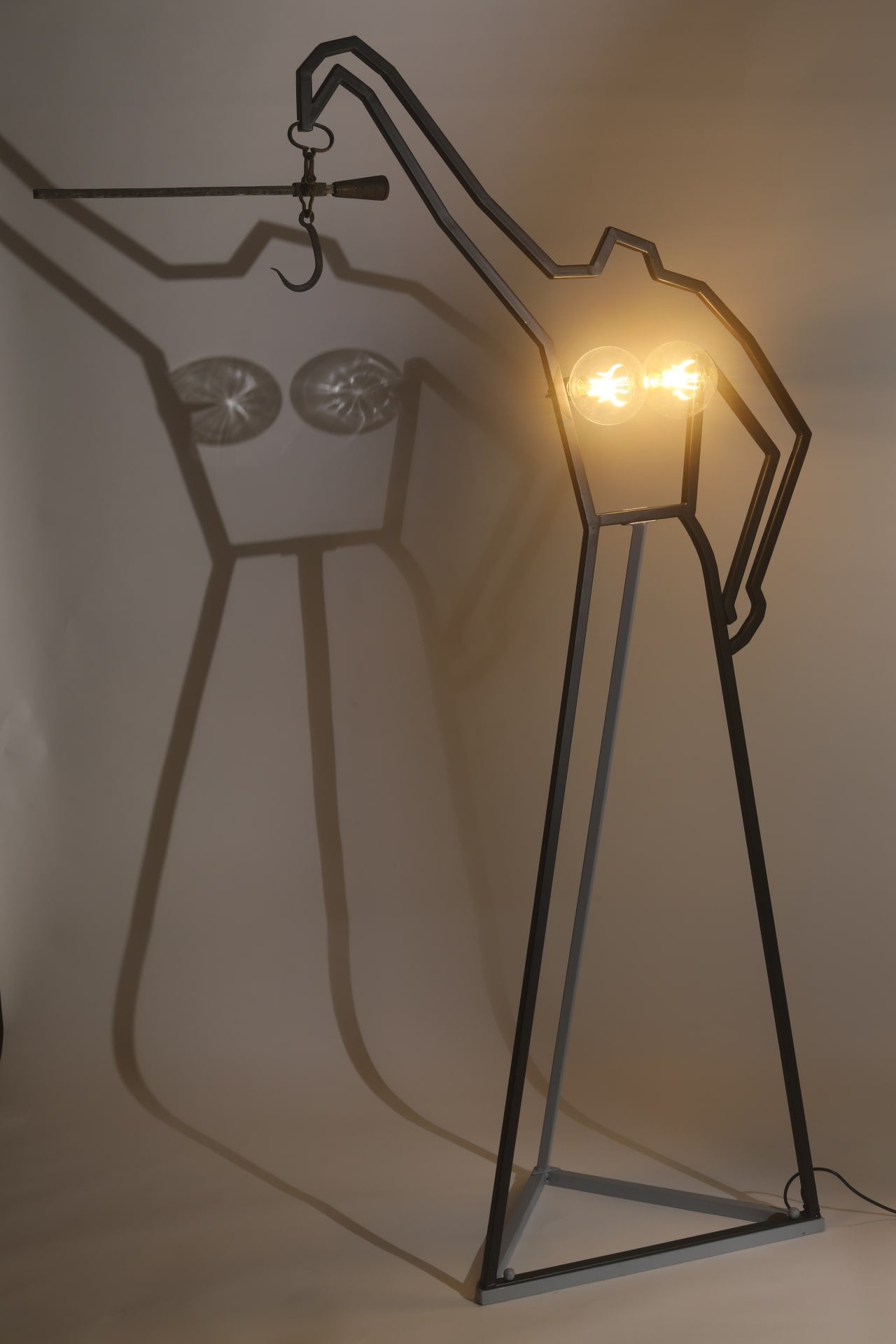 The exhibition’s organisers found two ceiling lamps inside a coil of steel wire in a rubbish dump. After taking a closer look at their discovery, they determined that it was a deformed figure of the goddess of justice (and fairness?). Careful restoration and straightening of the goddess’s disfigured lines led to the exhibited result. For some reason, the goddess is holding 19th century scales from a merchant house in the city of Tula in the Russian Empire. The head with the blindfold is missing. It can be used for its intended purpose — the scales are in perfect working order — or as an indoor light in cloudy or foggy weather.