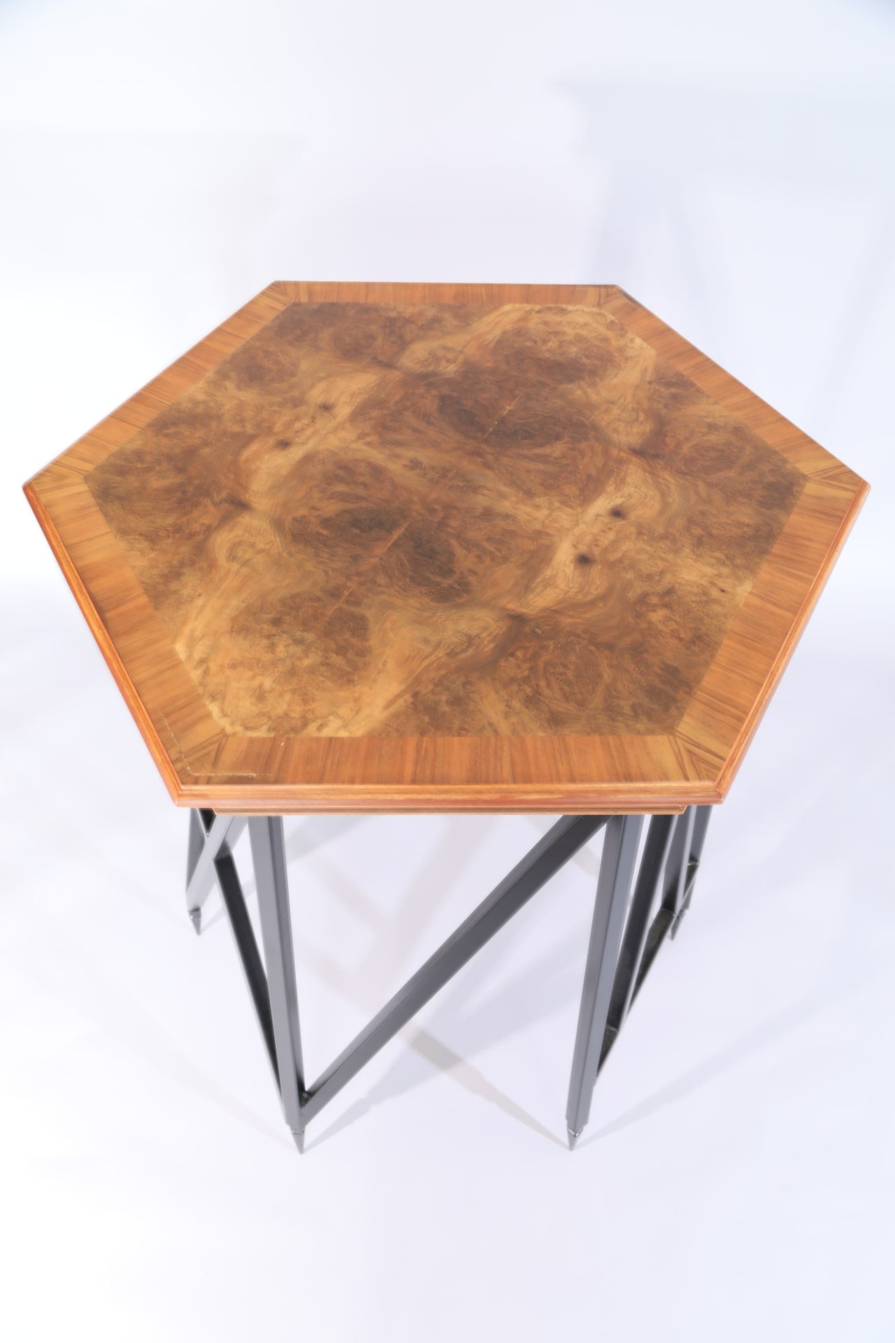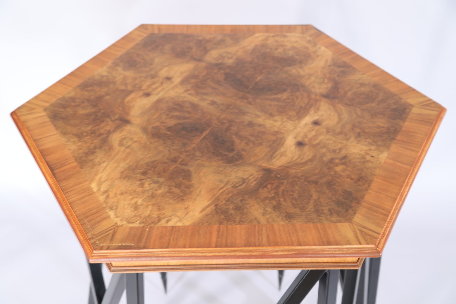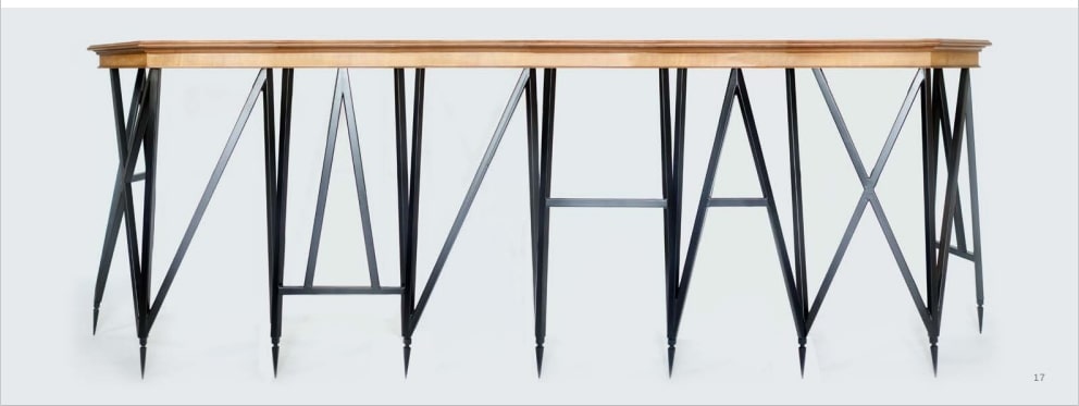 We know the exact year this was created — 2023. The style of the welds on the legs and the Cyrillic alphabet suggest that the table was made in Moldova, an ex-Soviet republic. This is also indicated by (the Caucasian walnut veneer with which the tabletop is finished. Only one person is comfortable at the table, everyone else - go fuck yourself!